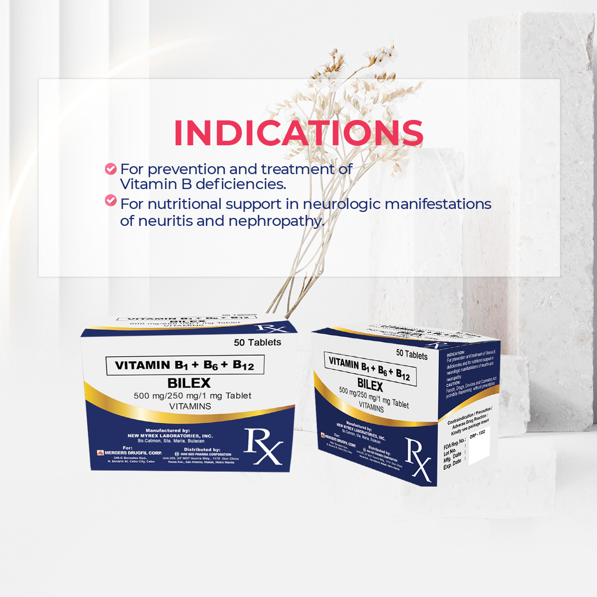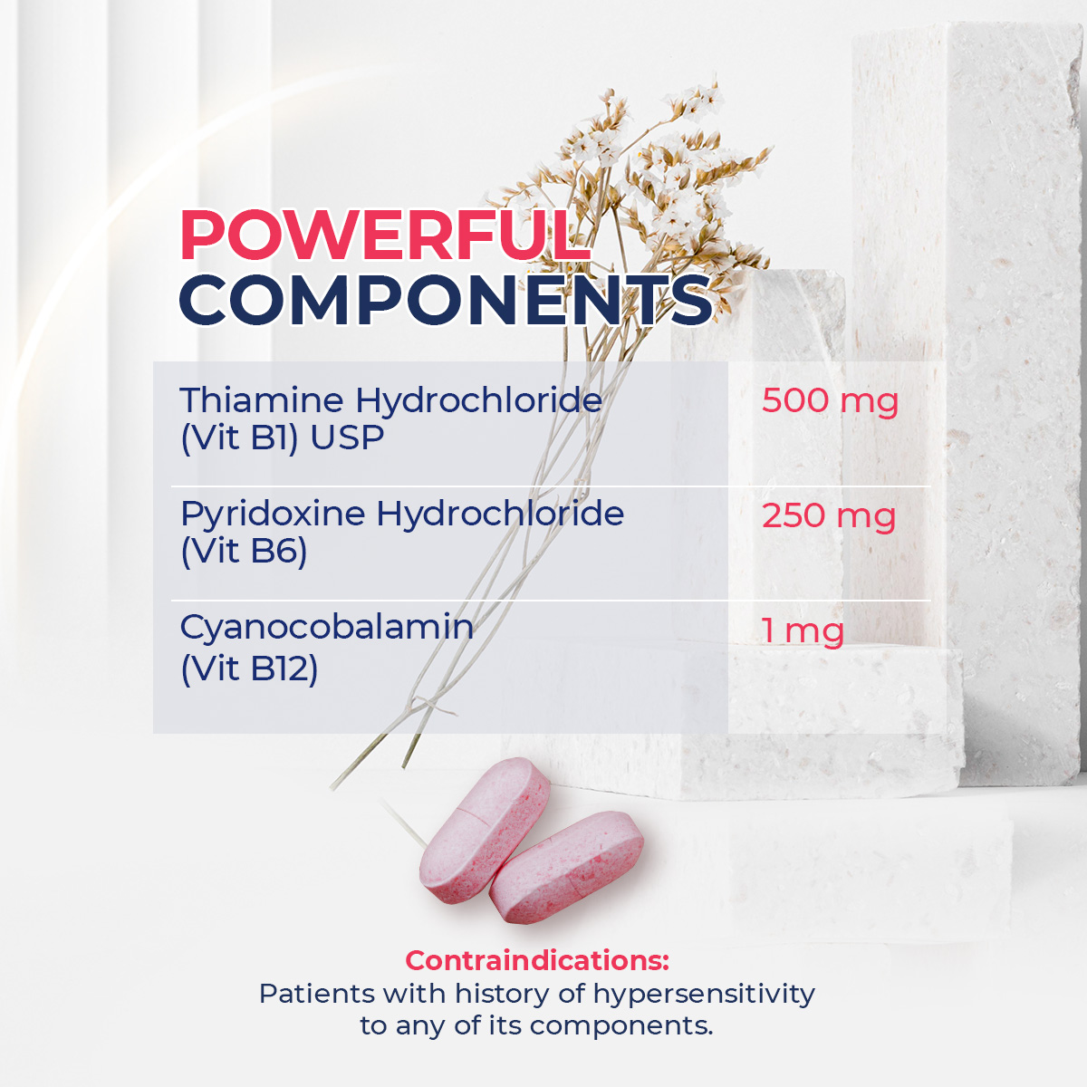 For nutritional support in painful, neurological manifestations of neuritis and neuropathy, polyneuritis, lumbago, ischialgia, cervical and shoulder-arm syndrome. Nueropathies associated with diabetes, cardiac disorders, drug-induced tuberculosis, leprosy and pregnancy. Alcoholic neuropathy due to INH or phenothiazine intoxication, hyperemesis gravidarum. For the prevention and treatment of Vit. B1, B6 and B12 deficiencies.